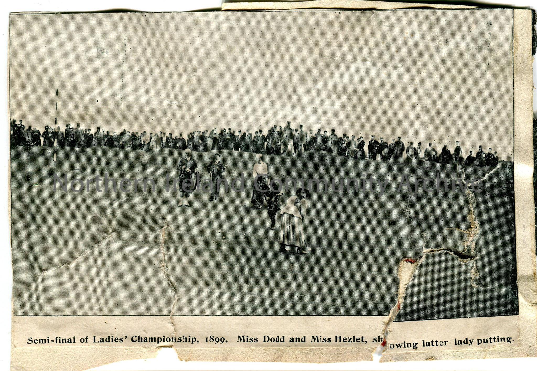 Photograph cut from larger paper page, showing Violet Hezlet putting during semi-final of Ladies Championship in 1899 - does not state name of championship or location.