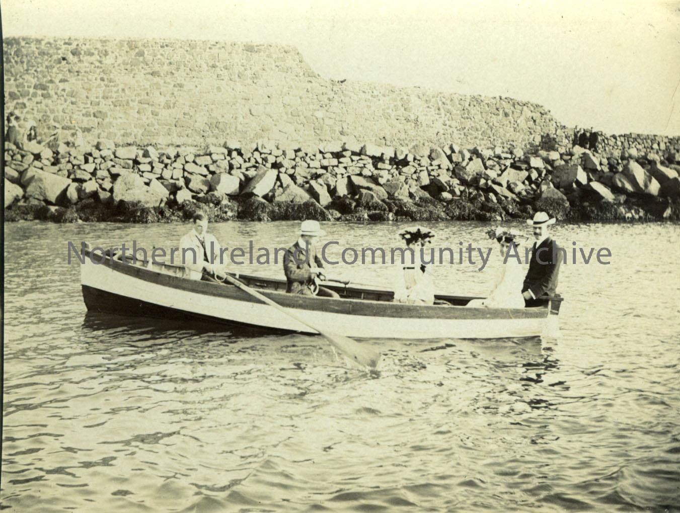 photograph depicting two females and three males in rowing boat. With rock wall in the background