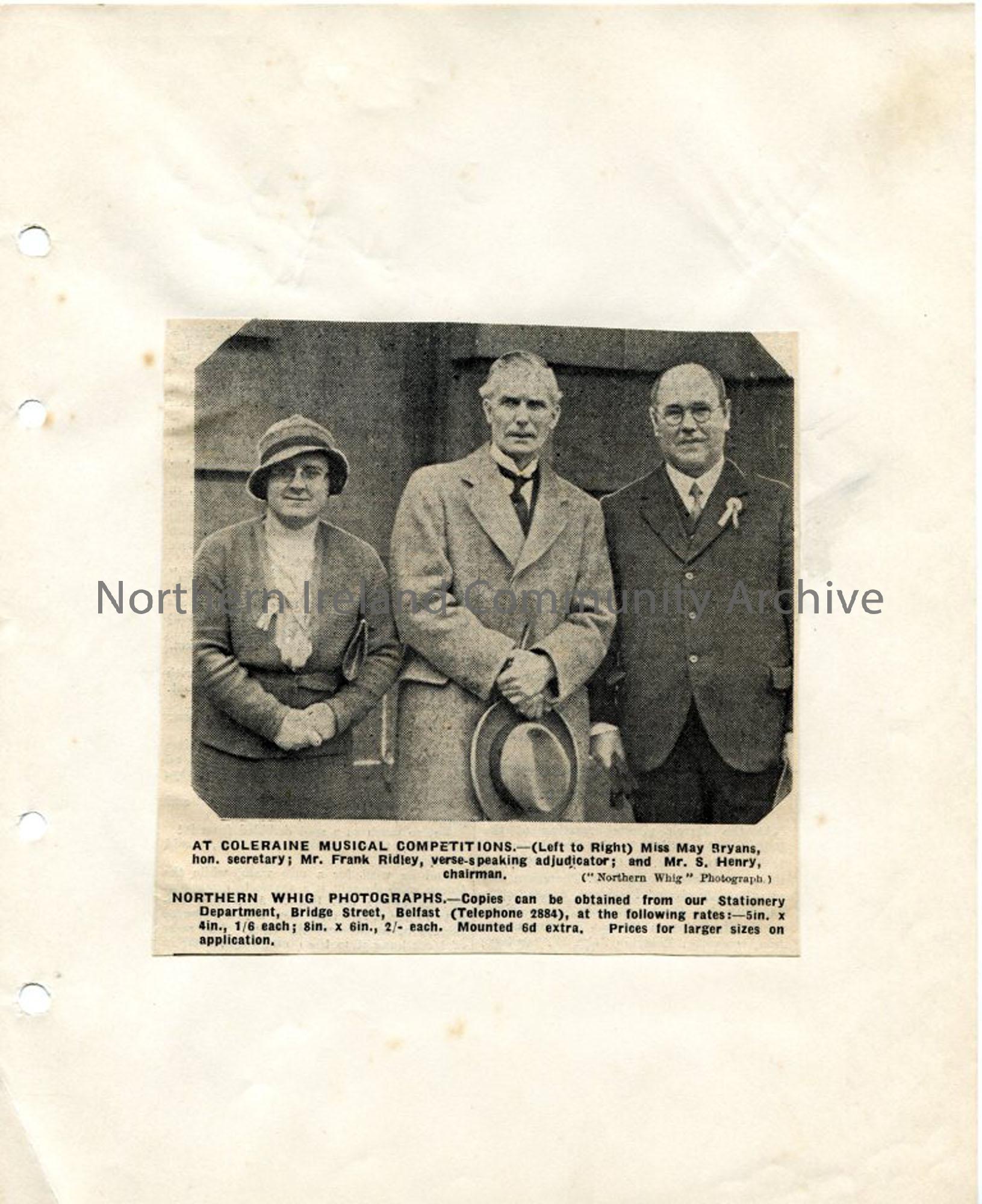 Newspaper cutting of photograph - Group of 3 at Coleraine Musical Competition - including Sam Henry as chairman.