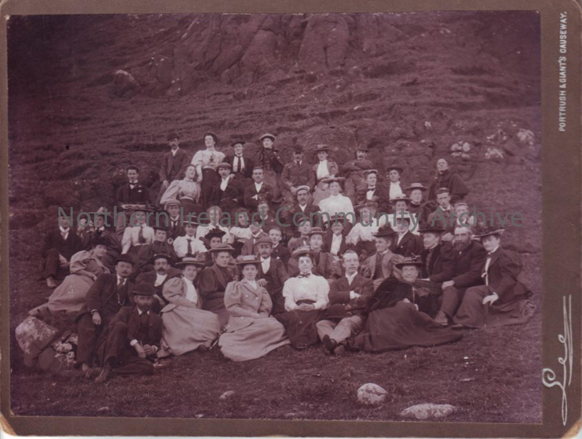 Photograph of a group of ladies and gentlemen sitting on a hill side. the photograph is Edwardian and is mounted on card which says Portrush & Giant’s…