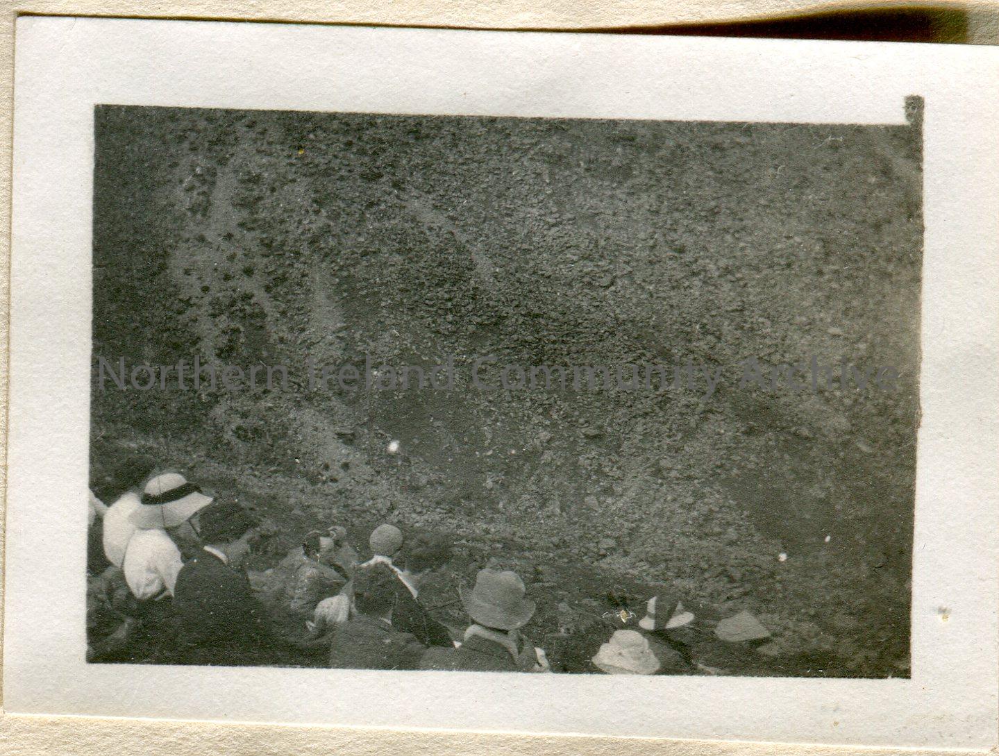 Photograph of a group of people sitting on the edge of a rocky hillside.