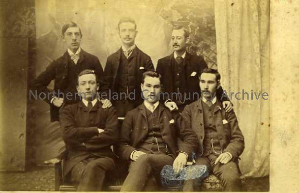 Photograph of a group of six unnamed gentlemen. The photo was taken by W. Mack whose studio was in New Row at the time.