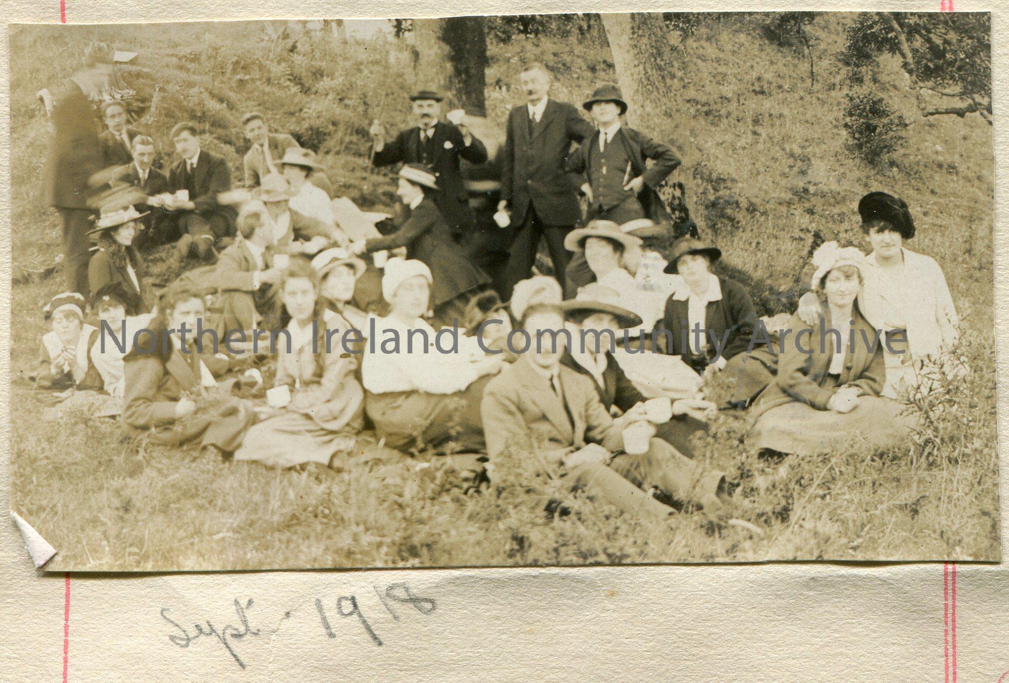 Photograph of a large group of people mostly seated on a hillside. Maimie Henry nee Liken is seated (fourth from right wearing white).