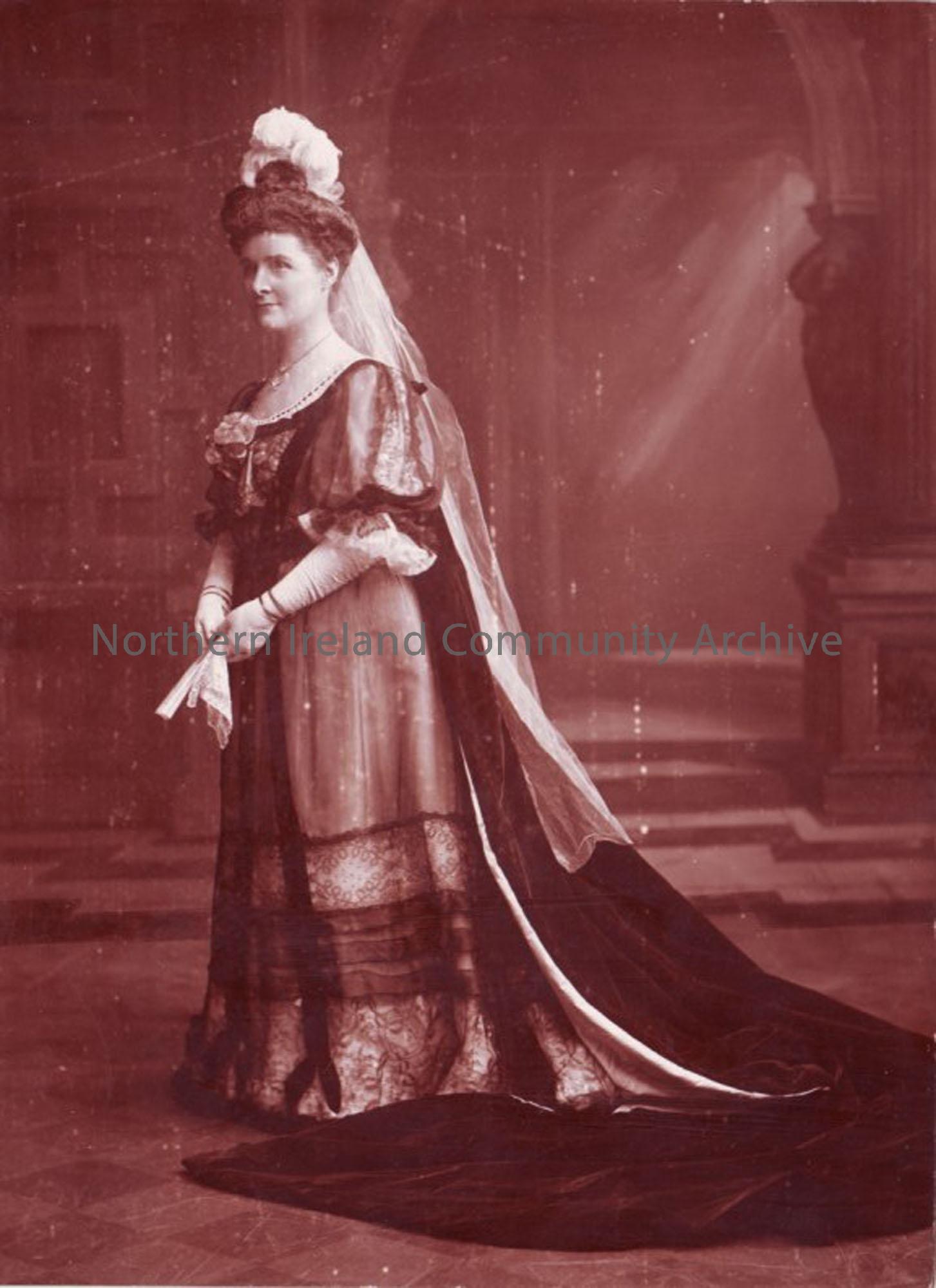 Photograph of Annie Boyd, Mrs John Stewart dressed to be presented to Queen Victoria (late 19thC)
