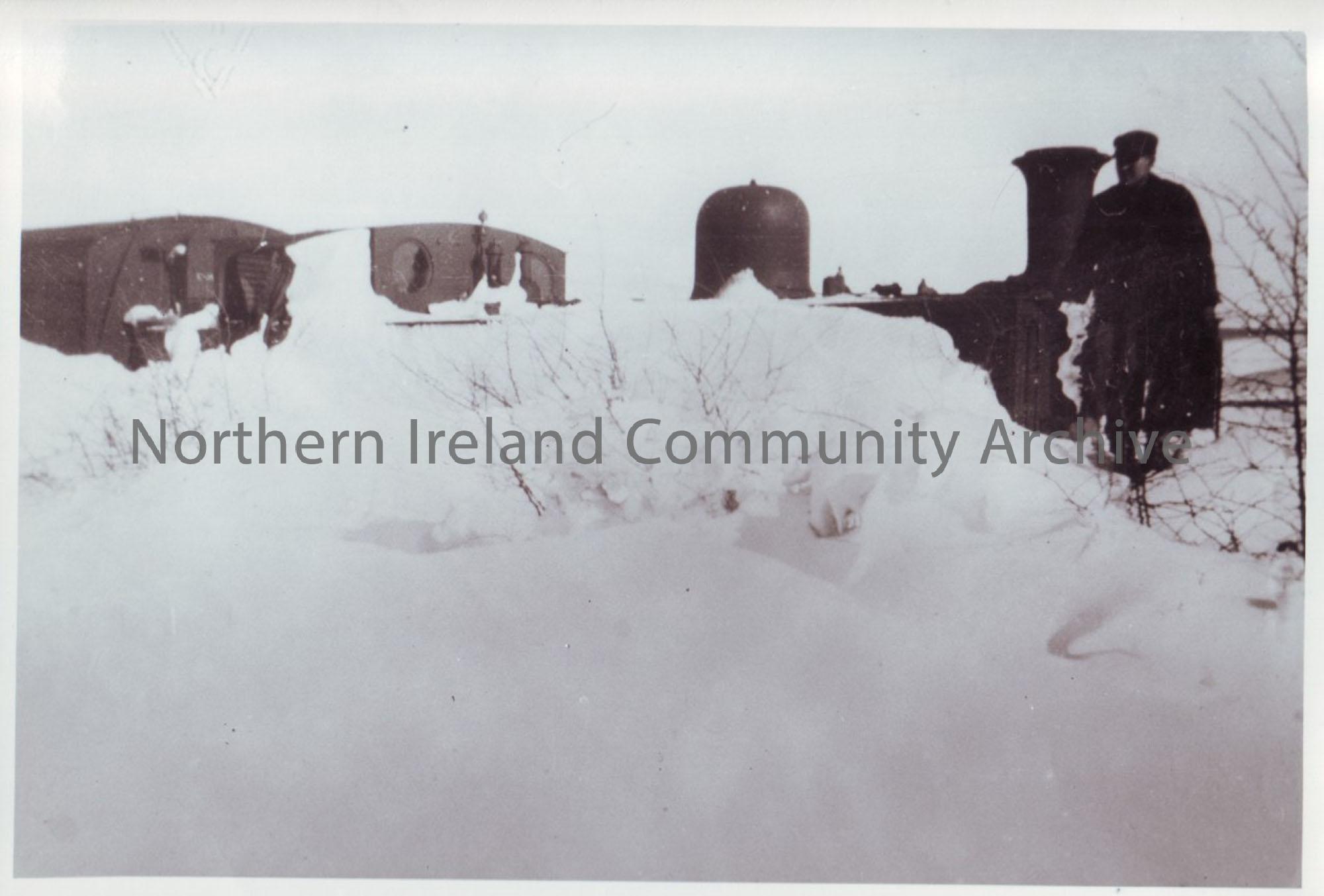 Photograph of Ballycastle to Ballymoney train stuck in the snow at near milepost 11 3/4 March 1947. Driver Mc Kissock who was sent out on releif train surveys the scene looking towards Delargy's house.