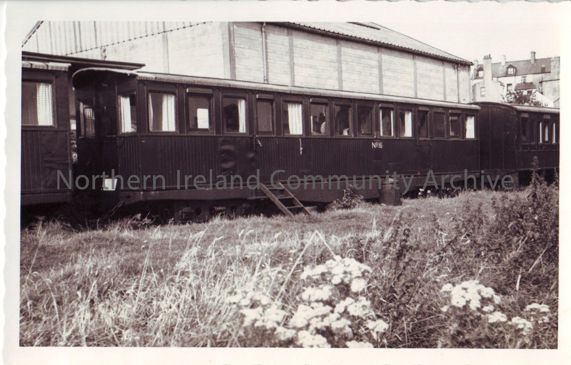 Photograph of caravan coaches at Ballycastle station after the line had closed.
