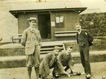 Photograph of four gentlemen playing bowls.