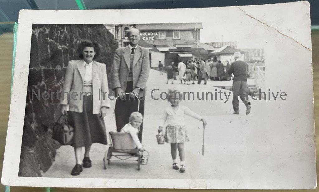 Photograph of Keith and Rosemary Browne, with their parents in 1950. The Arcadia Cafe, Portrush can be seen behind them. Courtesy of Keith Browne.
