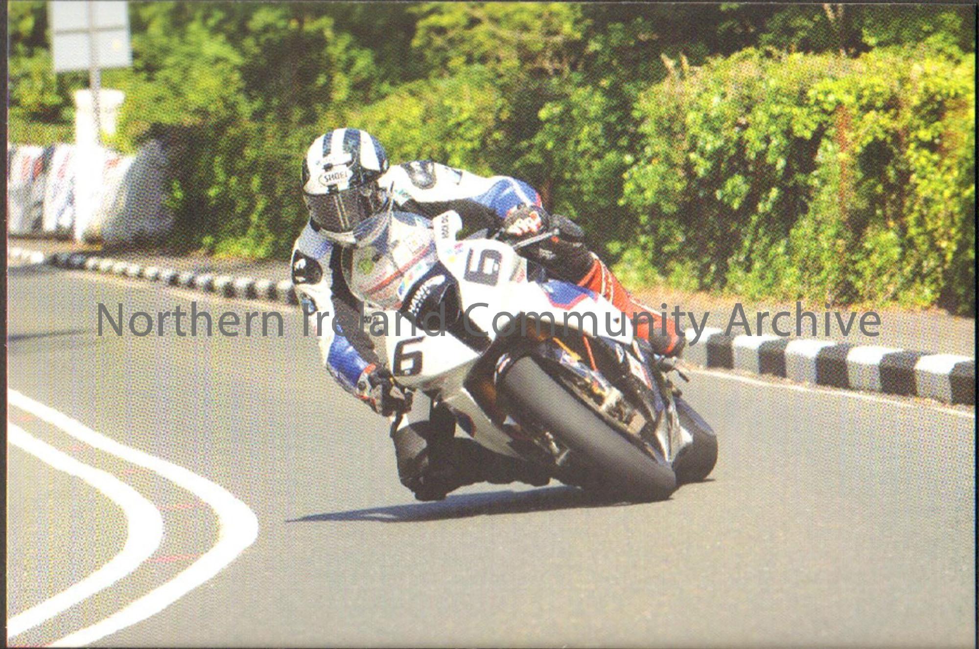 Photograph of Michael Dunlop riding a white motorbike with number 6 on the front wearing white and blue leathers and a white and black striped Shoei h…