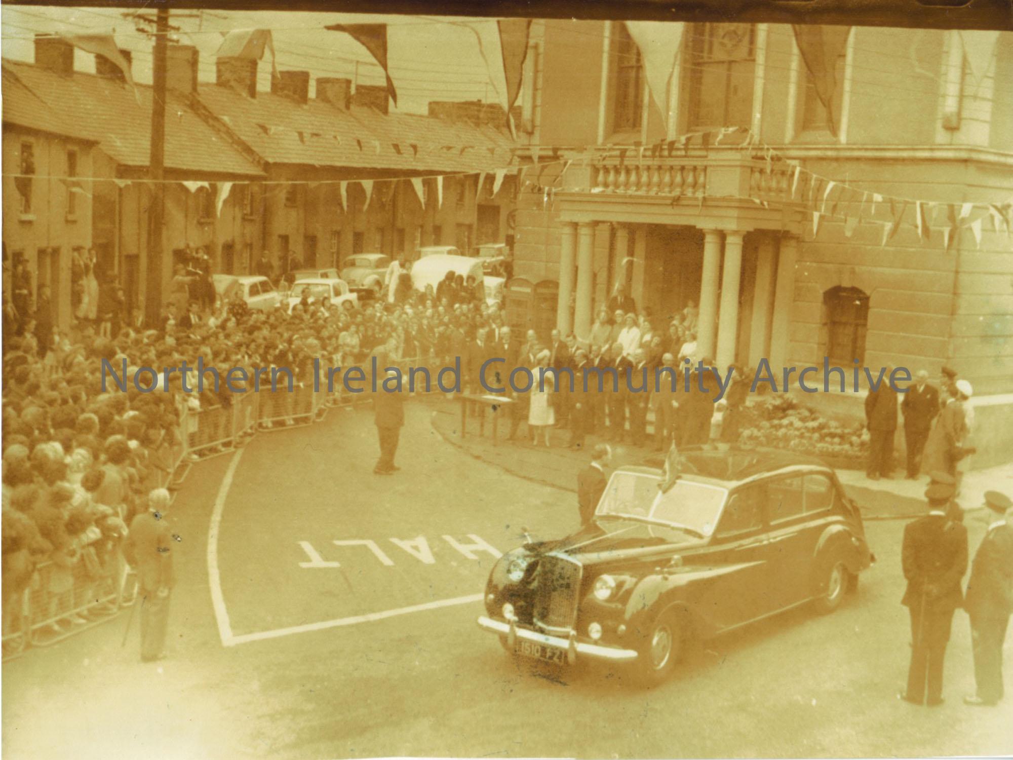 photograph of Princess Margaret's visit to Ballymoney, 1963. Taken from the offices of TV McCleanaghan on High Street. (Now Alexander & McMullan) Donor's husband was partner in firm.