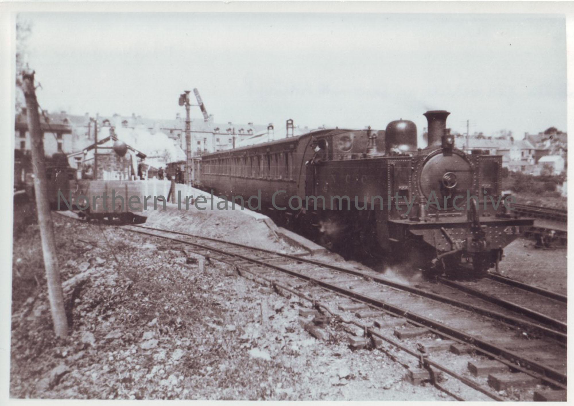 Photograph of the Ballycastle to Ballymoney service about to leave, May 1946. Far vehicle in sawmill may be spare Brown Brake Van