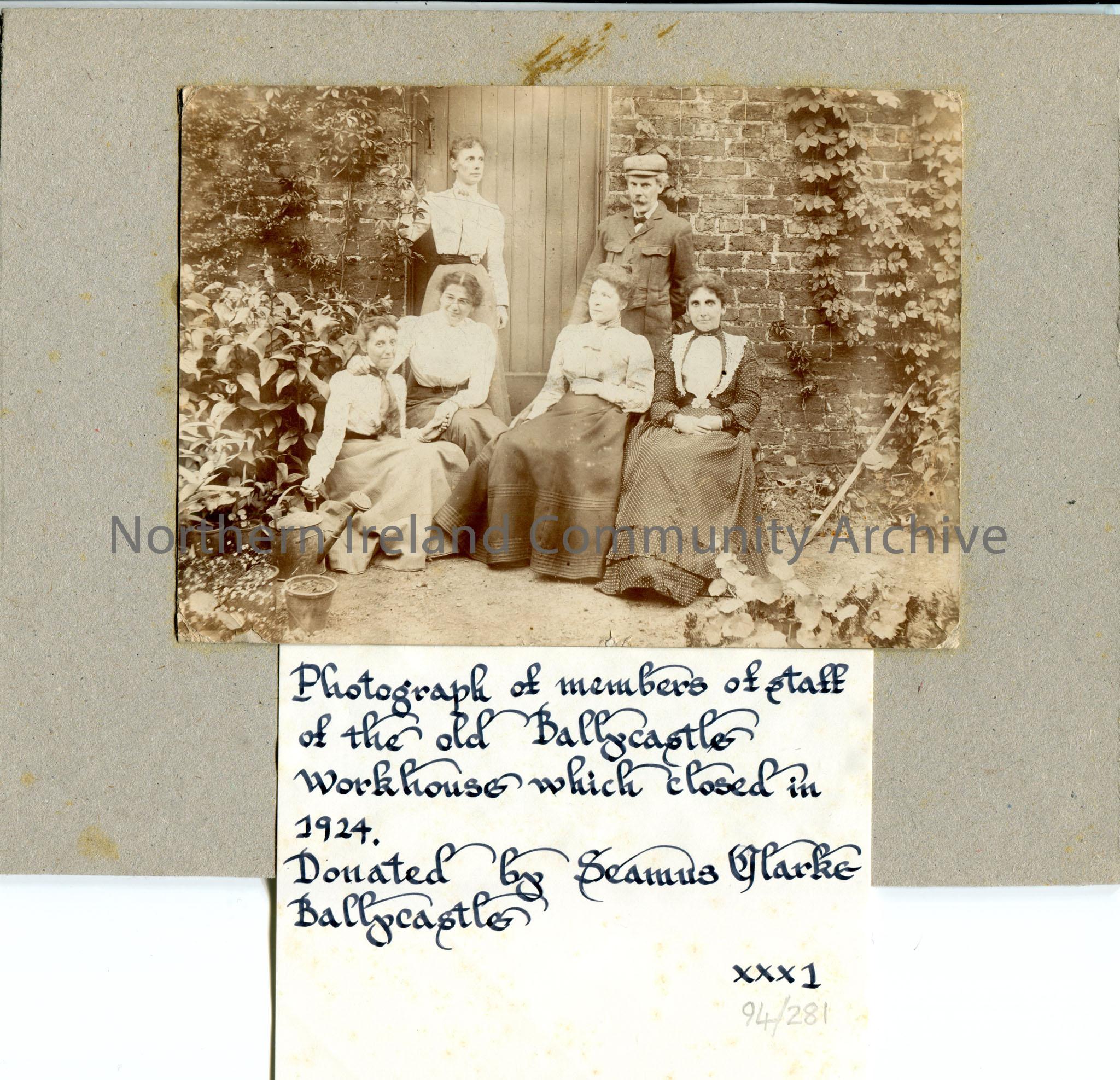 Photograph of the members of staff of the old Ballycastle Workhouse which closed in 1904. Photograph mounted on card.