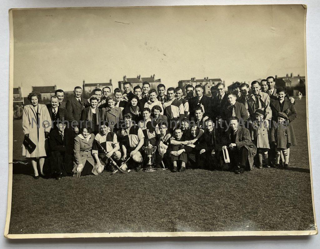 Portrush Hockey Team, photographed on the hockey field with trophy and supporters. Courtesy of the McNally family.