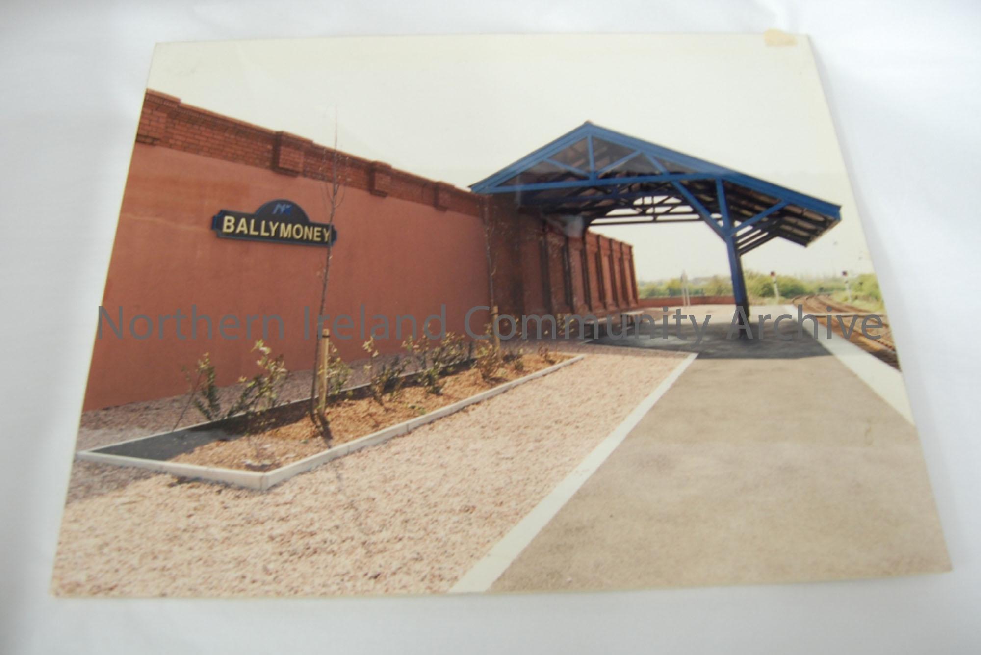 photograph on spongeboard of the lower end of the platform of Ballymoney train station showing newly planted trees