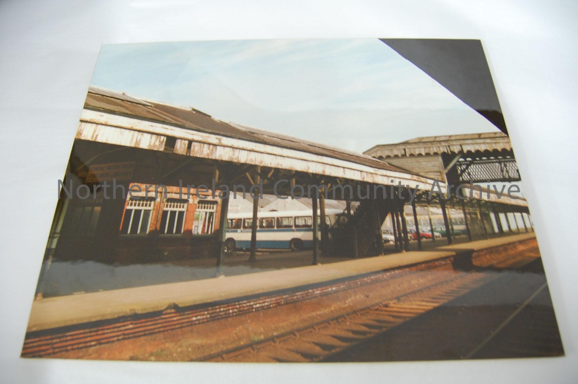 photograph on spongeboard of the platform of Ballymoney train station with an ulsterbus in the background
