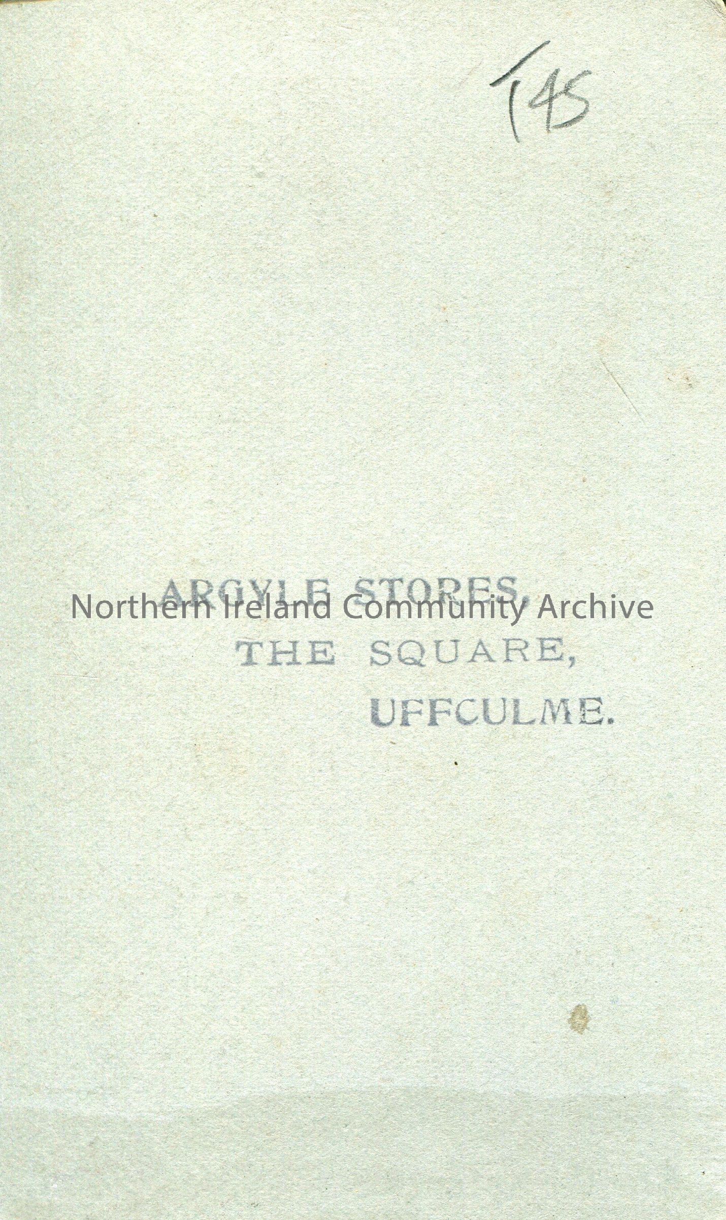 Photograph pasted to card ‘The Compliments of The Season’ – ‘Argyle Stores, The Square, Uffculme’. Features a man and four women standing in front of … – T45c