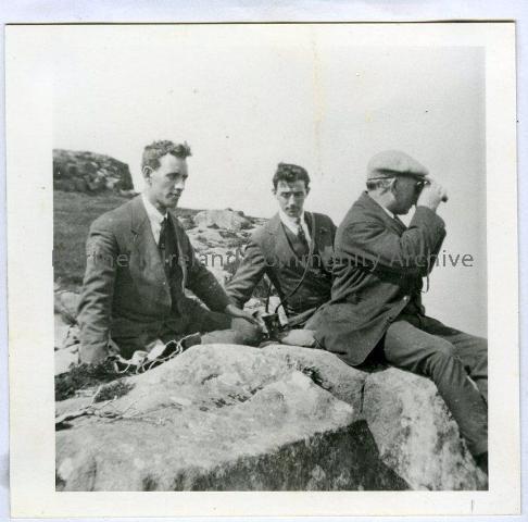 Copy of a photograph of Mr Stephen Clarke (seated right), Manager of Ballycastle Home Industries (An Tuirne beag), Ballycastle with two companions. The original photograph has been identified in the collection. Courtesy of Ballycastle Museum.