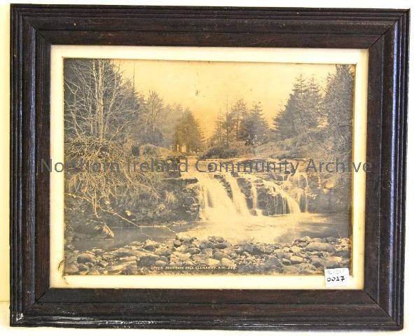 Upper Parkmore Falls, Glenariffe. The frame in spruce was made in the Irish Home Industries Workshop, Ballycastle. Courtesy of Ballycastle Museum