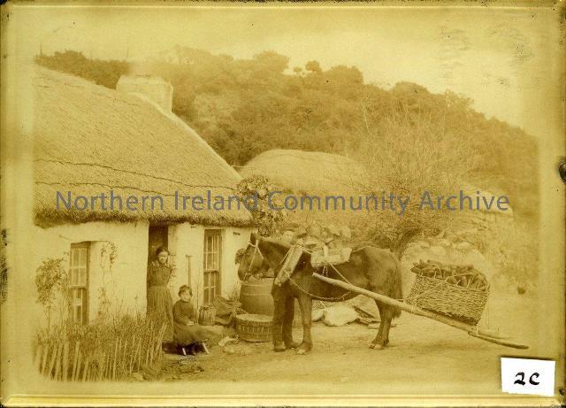 Photograph on glass of slipe/slide car outside cottage. This primitive vehicle which consists of a strong willowy basket fixed on strong shafts without wheels, was used on rough hilly slopes in the glens of Antrim. It was adaptable to any ground where wheels would get bogged down etc. Courtesy of Ballycastle Museum.