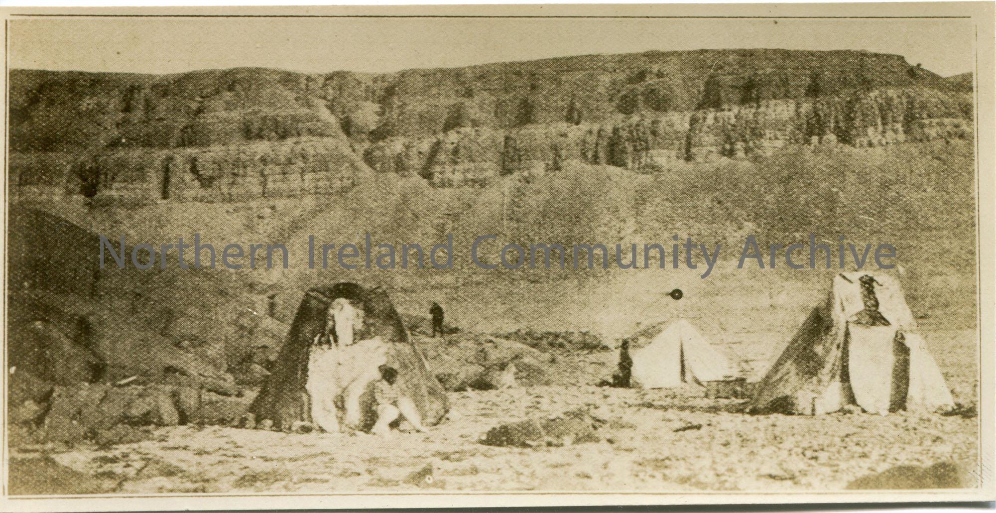 Photographic image of mountain with tents in the foreground. Captioned on reverse, ‘Native Skin Tents at Bache’. Numbered 1237.