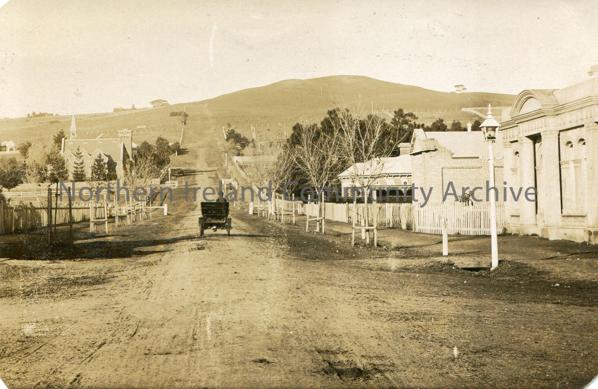 Photographic image on back of a postcard of Whyte Street, Coleraine, Victoria, Australia. Street scene. Church on left side and a man on a cart going towards a hill. 'Northern Constitution, 2 cols x Pro ... 11739' written in pencil on back of postcard.