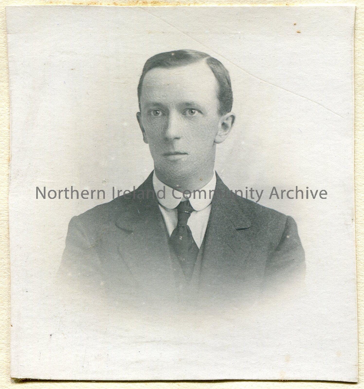 Photographic portrait image of a man wearing a suit and tie. Dated 1918.