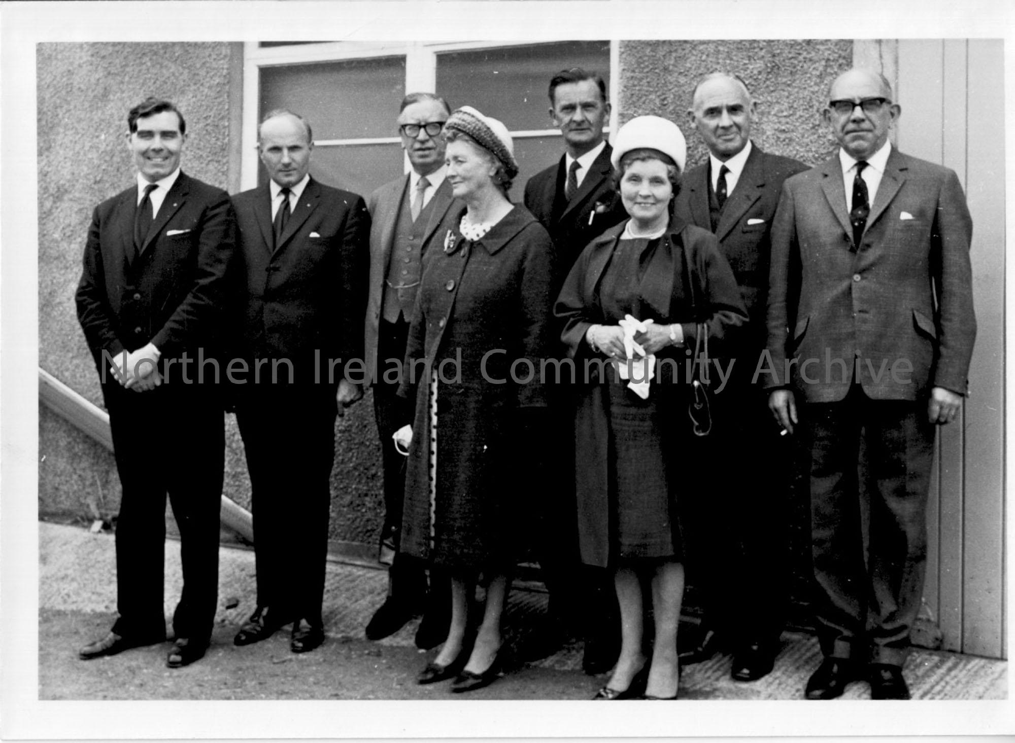 Photographic print of 2 ladies and 6 men posing outside a building