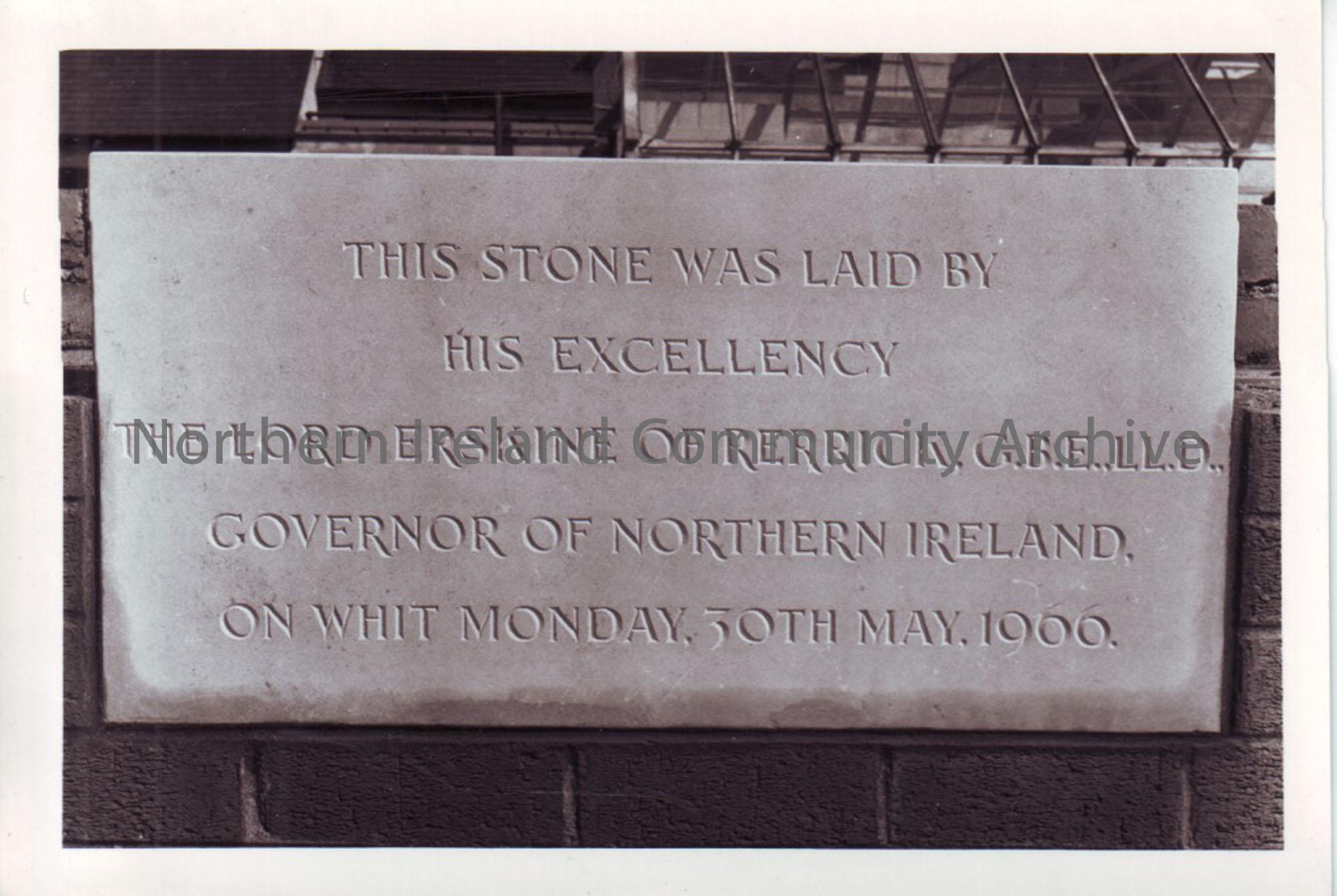 Photographic print of Dalriada school stone placed into the wall. It reads: This stone was laid by his excellency The Lord Erskine of Rerrick, G.B.E.,LL.D., Governor of Northern Ireland, on Whit Monday, 30th May, 1966.