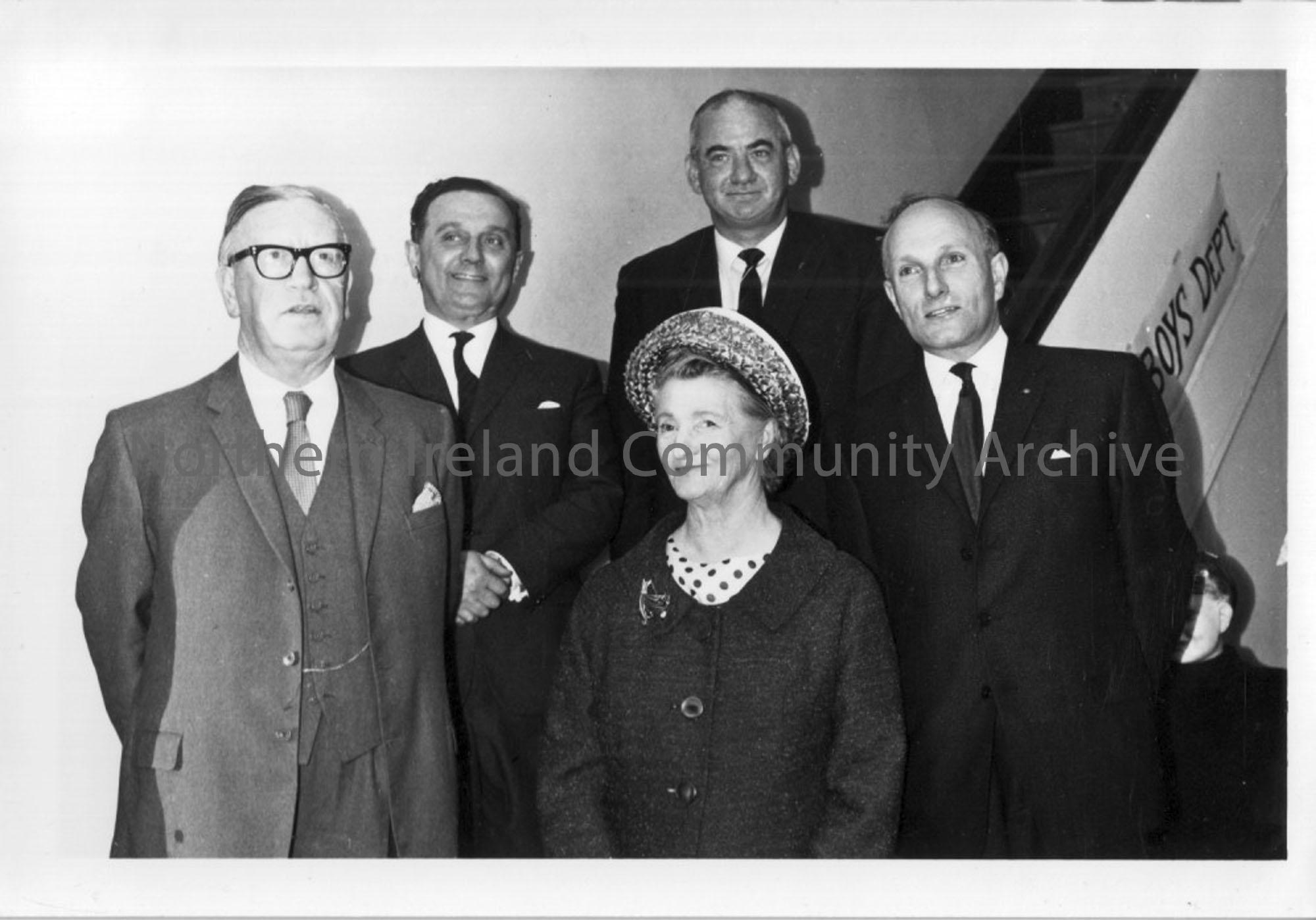 Photographic print of five people standing in front of steps with the sign Boys Dept seen in the background
