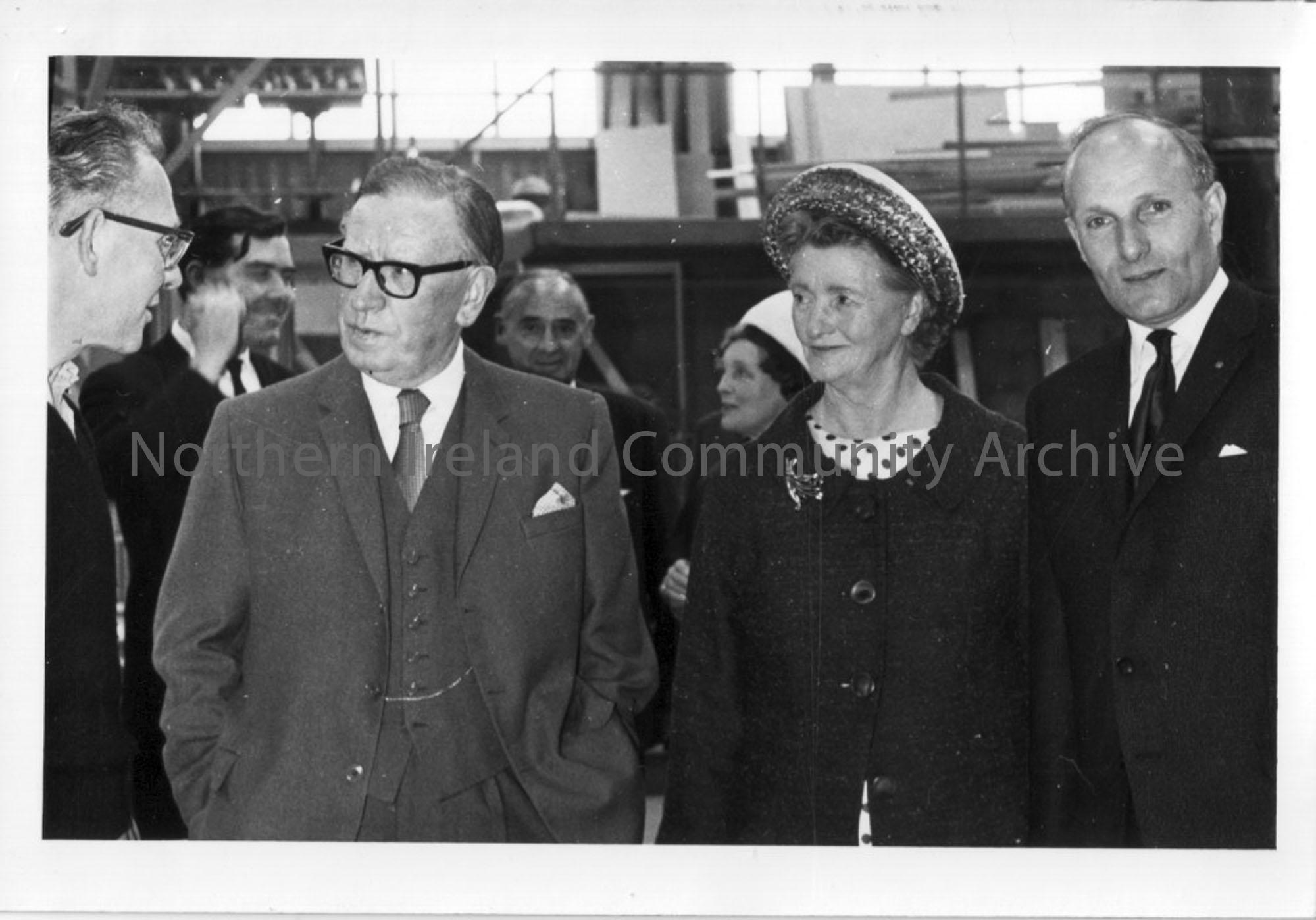 Photographic print of four people talking during what could be a showing of the building work.