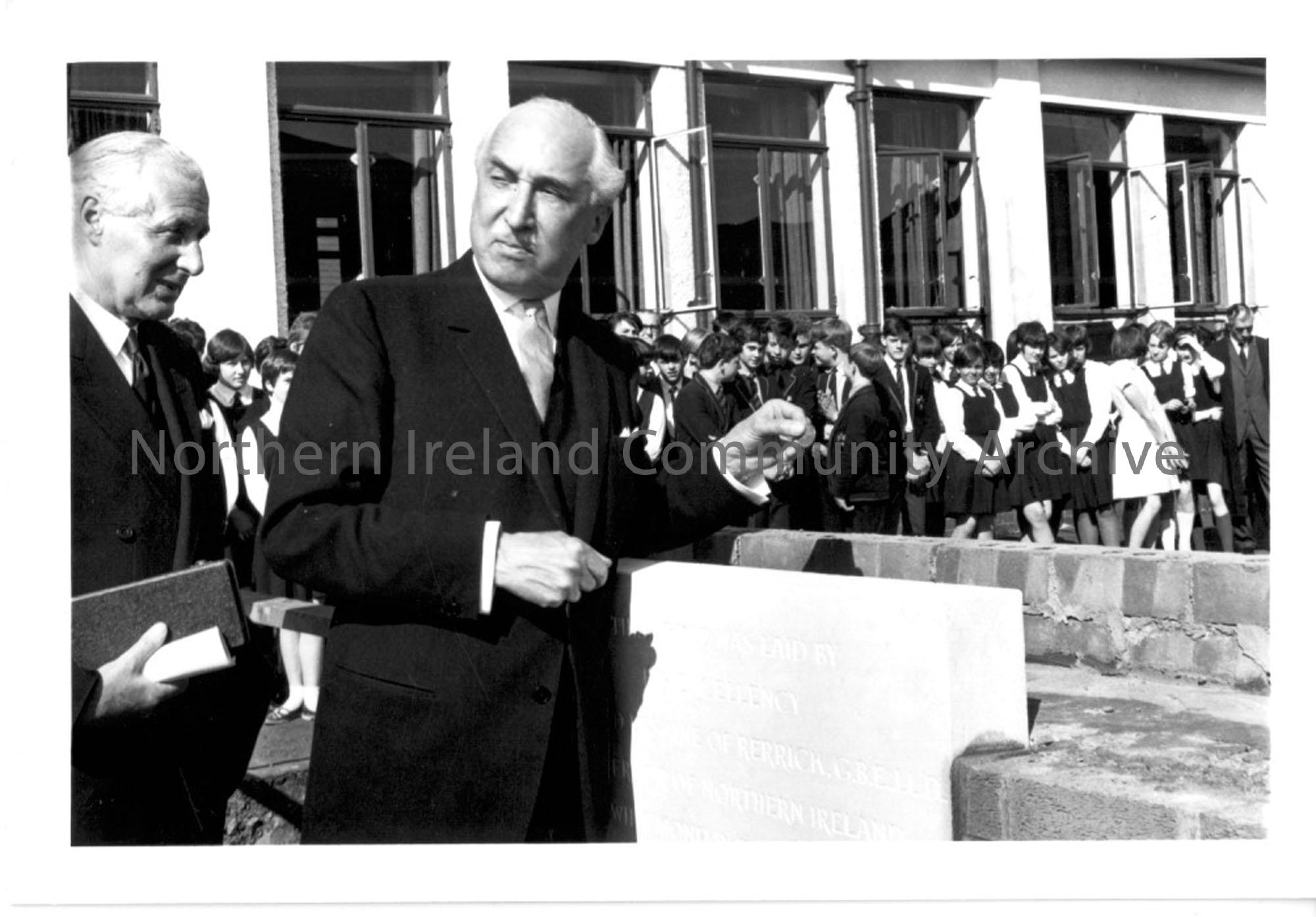 Photographic print of Lord Erksine placing a penny behind the stone at Dalriada
