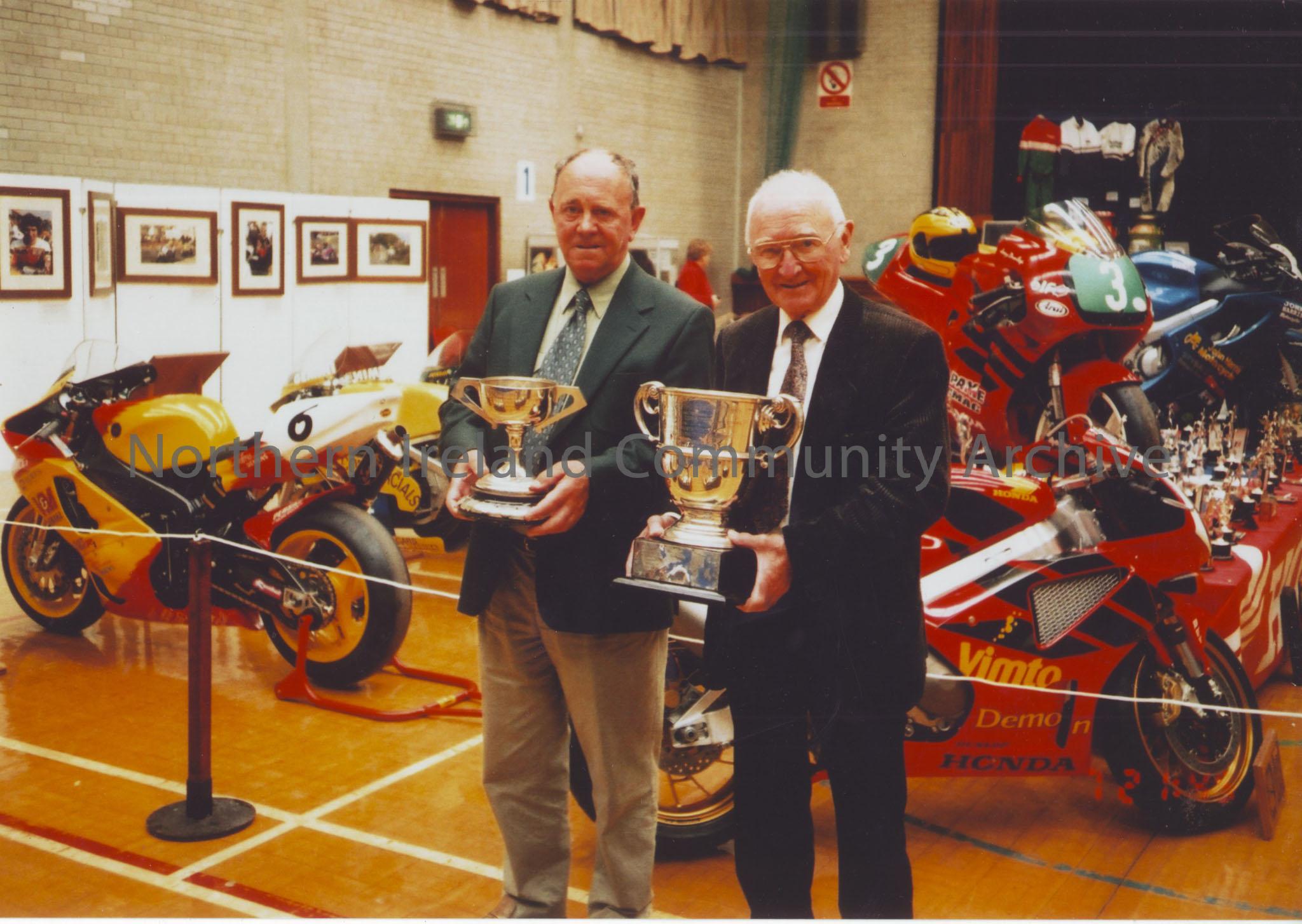 Photographs from Joey Dunlop exhibition May 2003. Photos include, Manxman Alan (W.A) Holmes (Dark Suit) with long time friend, local resident Jim McDe… – 2011.73 (2)