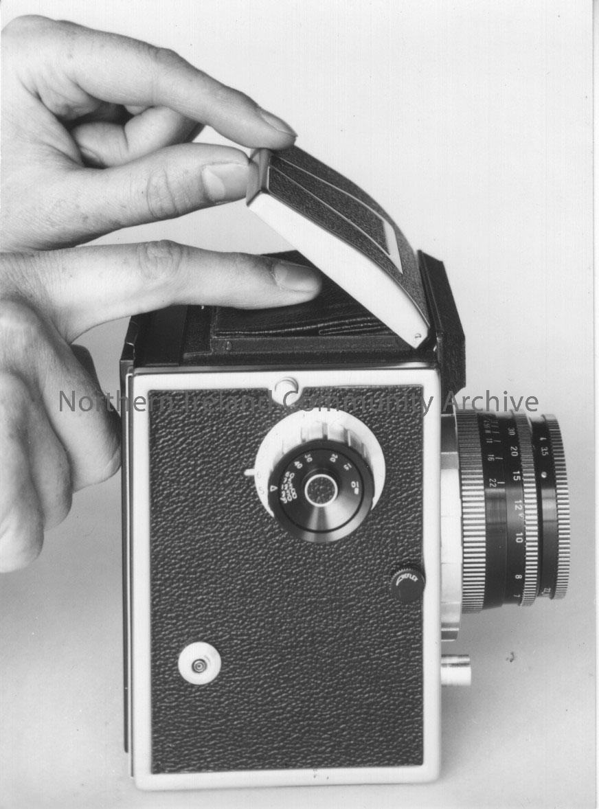 Photographs of a Corfield 66 camera modelled by Pat Williams. – 2011.265 (2)