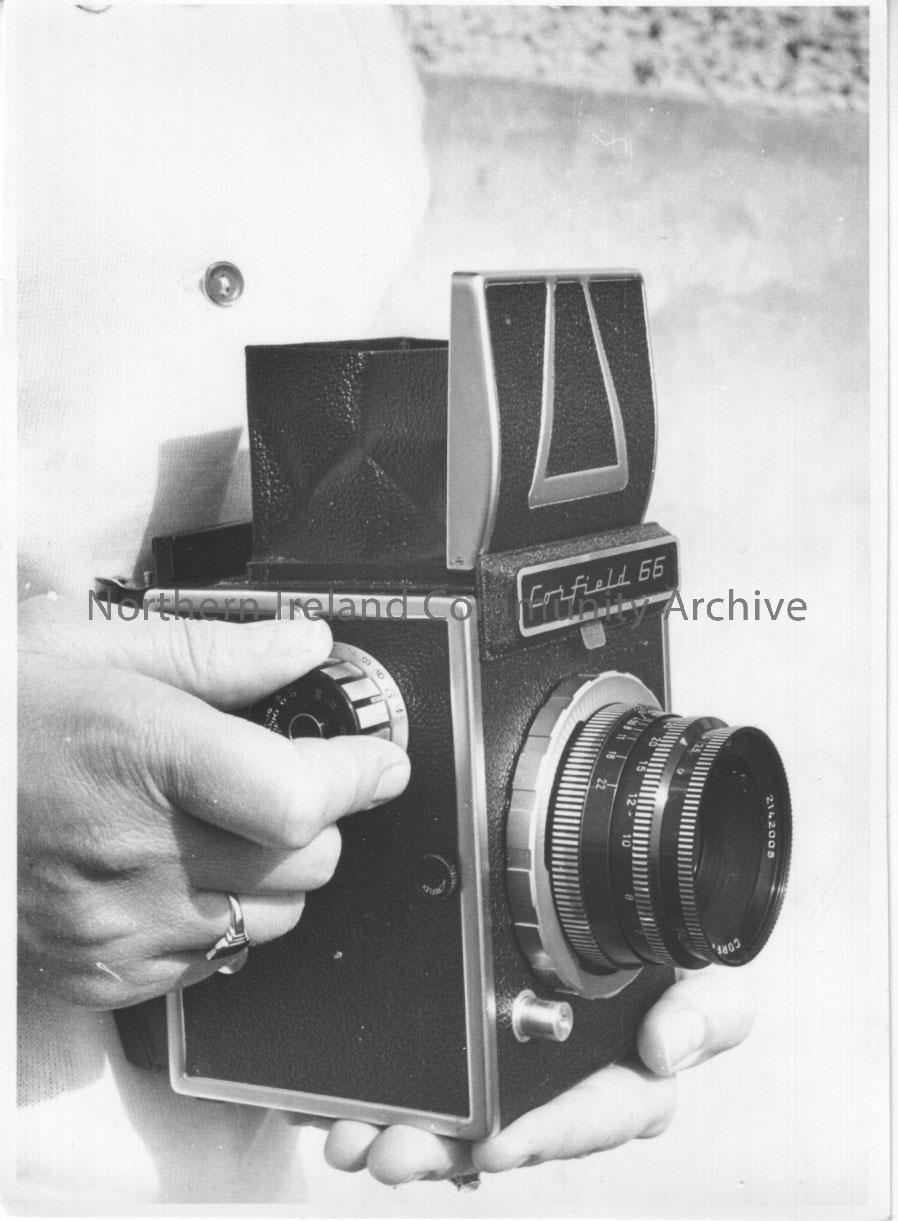 Photographs of a Corfield 66 camera modelled by Pat Williams. – 2011.265 (7)
