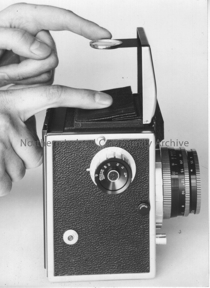Photographs of a Corfield 66 camera modelled by Pat Williams. – 2011.265