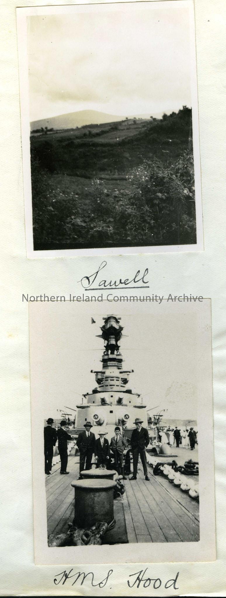 Photos of Sawell and HMS Hood that have been pasted to paper.The figure on the left may be Sam Henry.