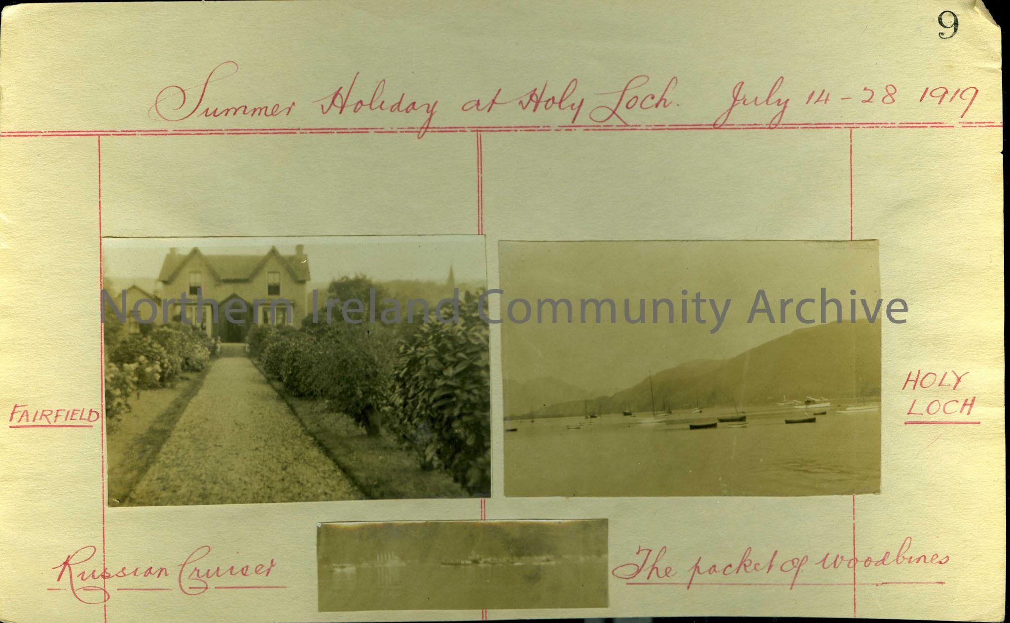 Photographs taken whilst on holiday at Holy Loch in July 1919. They show a house named "Fairfield", a scene of the loch and a photo of a Russian cruiser.