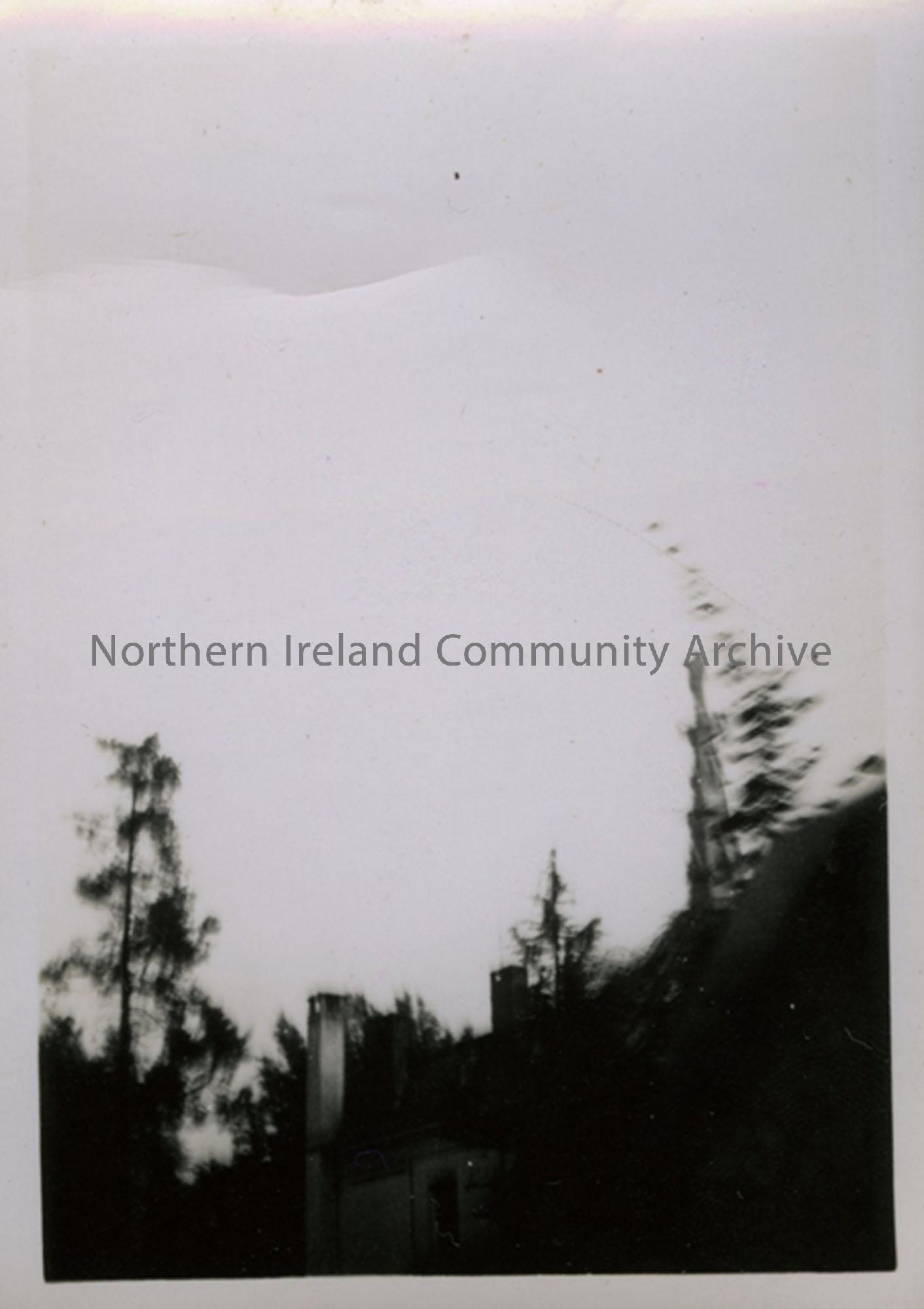 Picture of a skyscape with a statue seen over the tree tops.