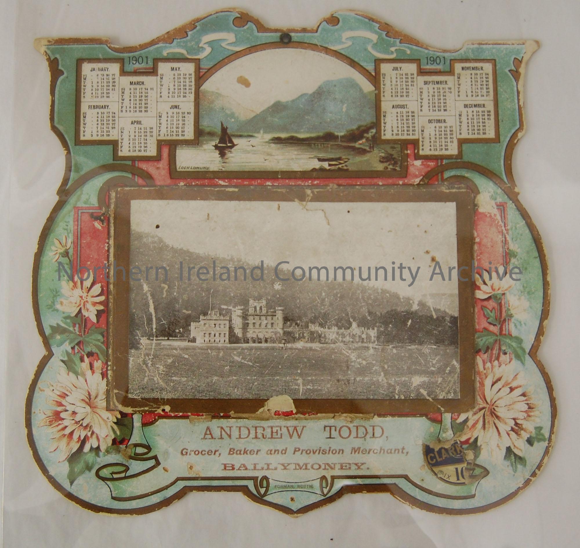 Picture of Taymouth Castle, calendar advertises Andrew Todd, Grocer, Baker and Provision Merchant, Ballymoney, 1901.