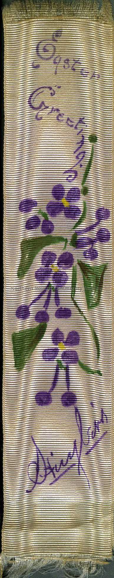 piece of ribbon handpainted with lilac flowers and greenery, with Easter greeting, to use as bookmark