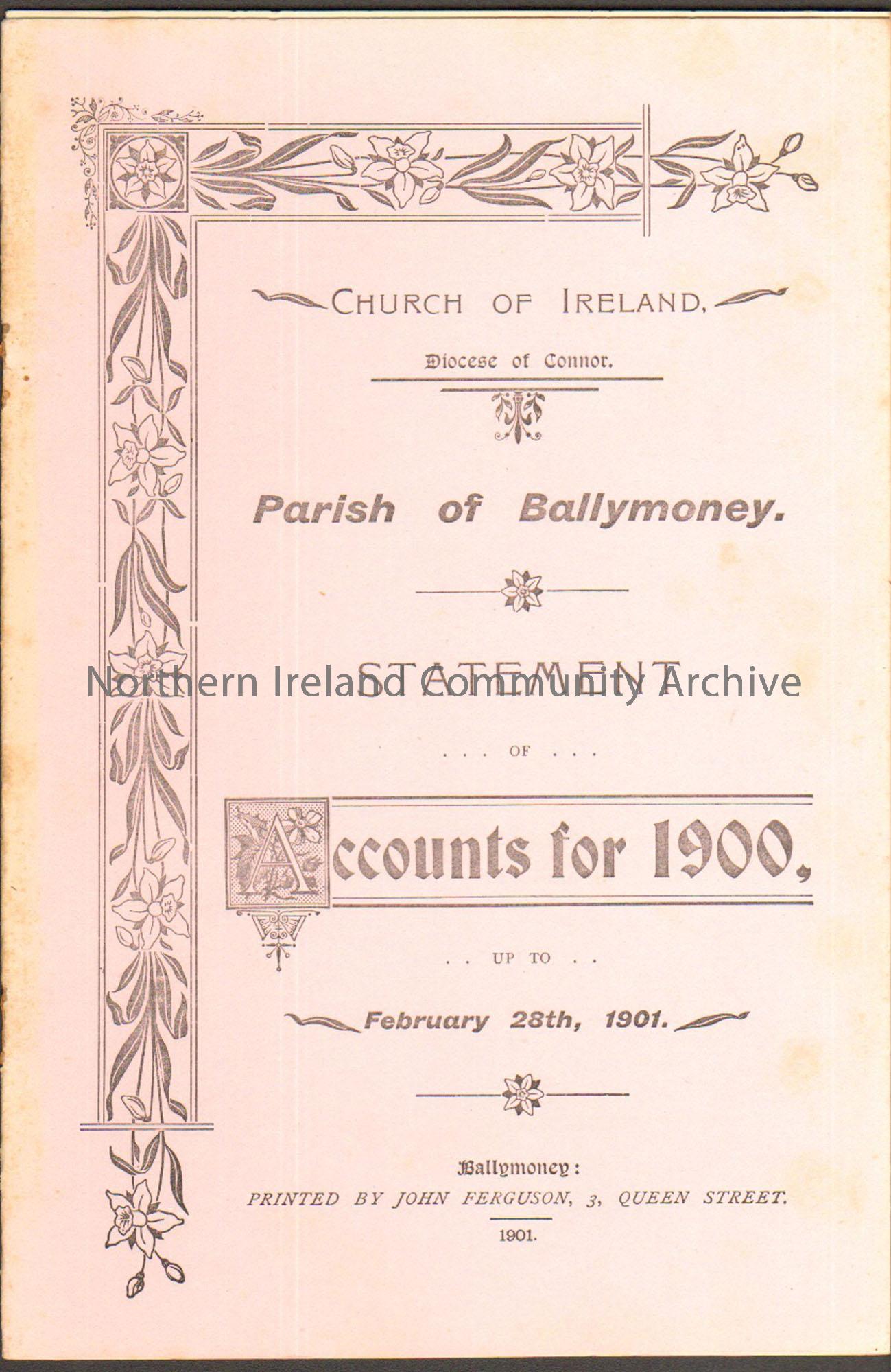 Pink booklet. Church of Ireland, Parish of Ballymoney, Statement of Accounts for 1900 up to February 28th, 1901