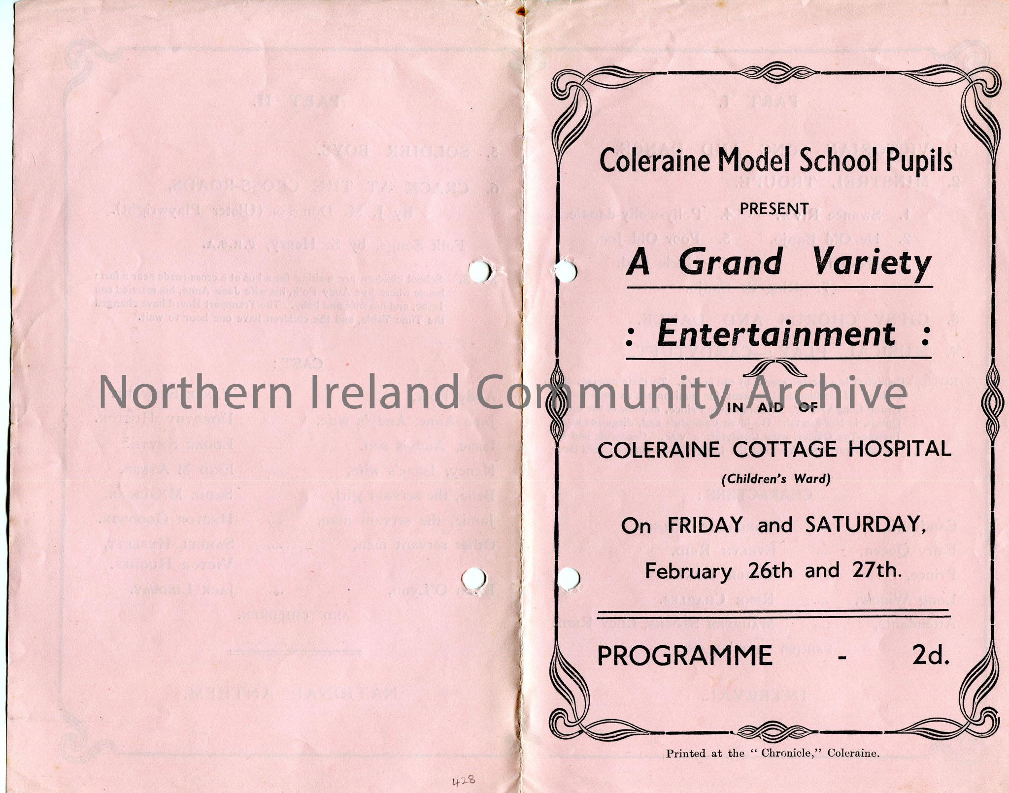 Pink booklet. Programme of Coleraine Model School Pupils presenting “A Grand Variety: Entertainment:”. In aid of Coleraine Cottage Hospital Children’s…