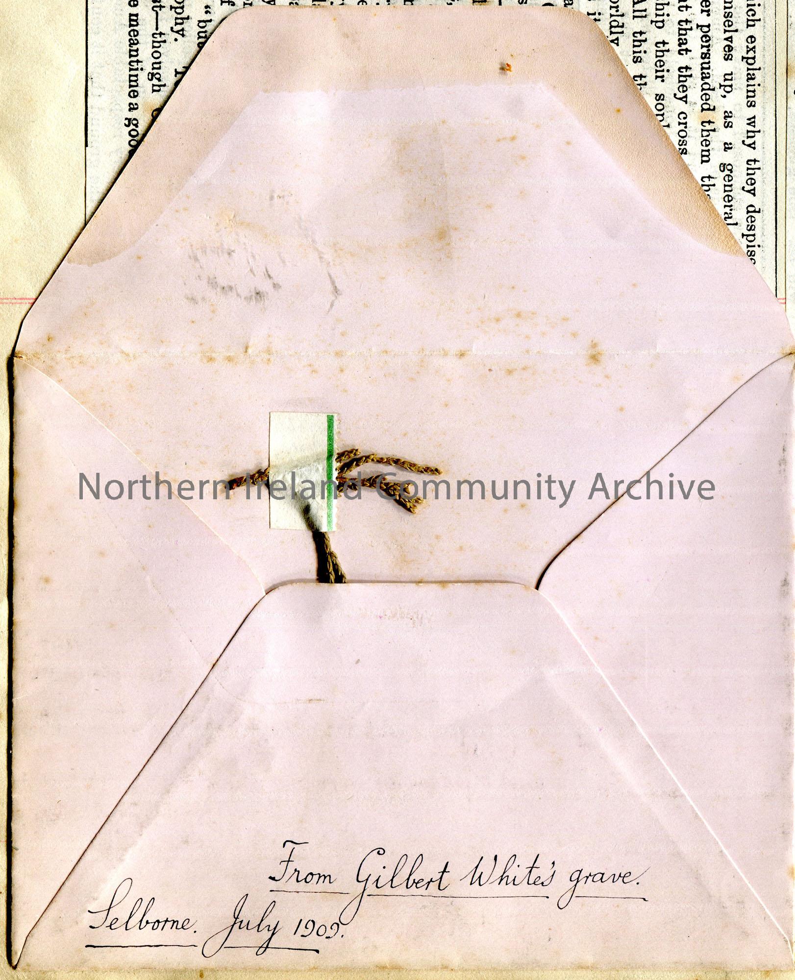Pink colour enveloped labelled in black ink, 'From Gilbert White's grave. Selborne. July 1909. Inside is a small part of a leaf, organic matter, taped to the inside of the envelope.