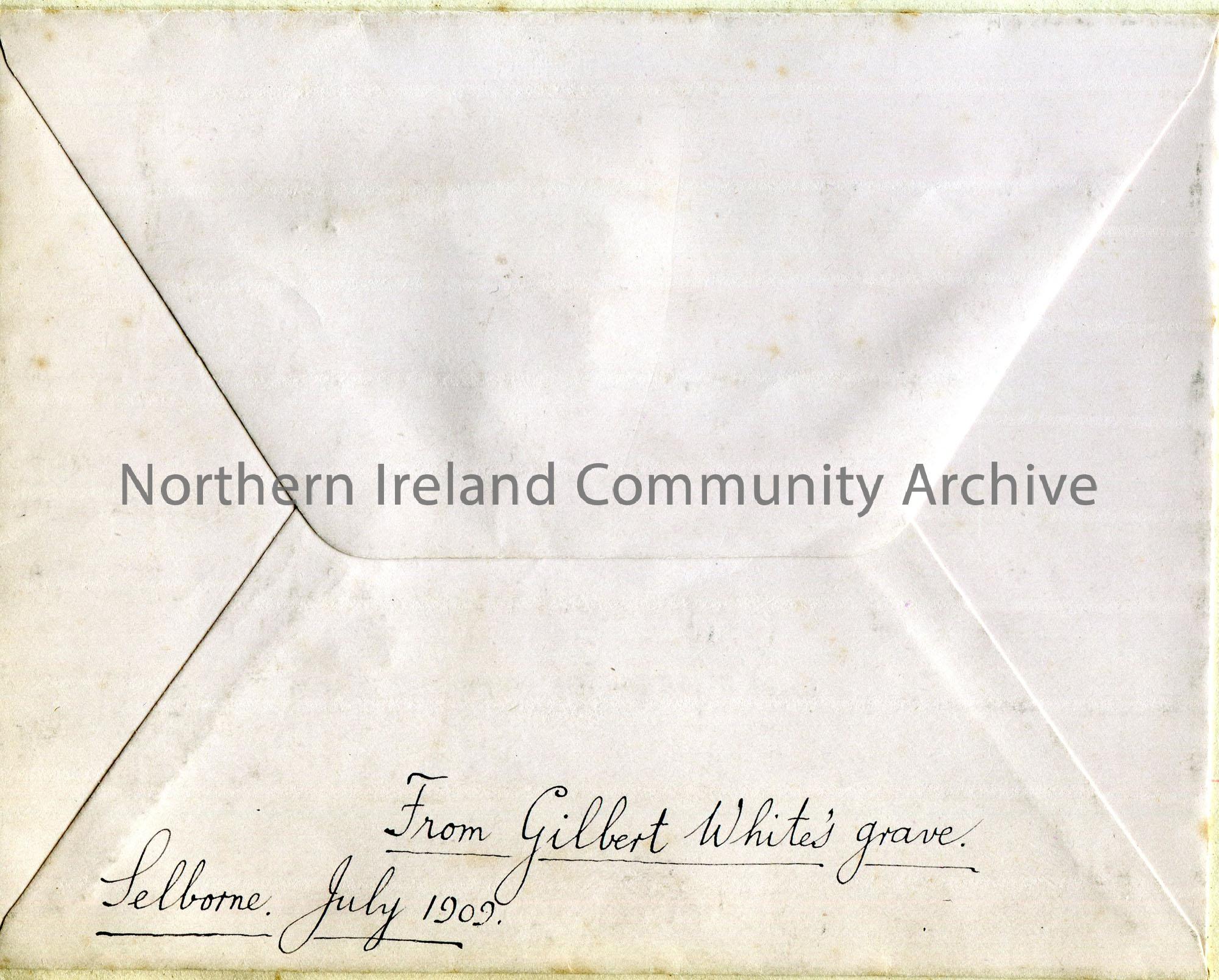 Pink colour enveloped labelled in black ink, 'From Gilbert White's grave. Selborne. July 1909. Inside is a small part of a leaf, organic matter, taped to the inside of the envelope.