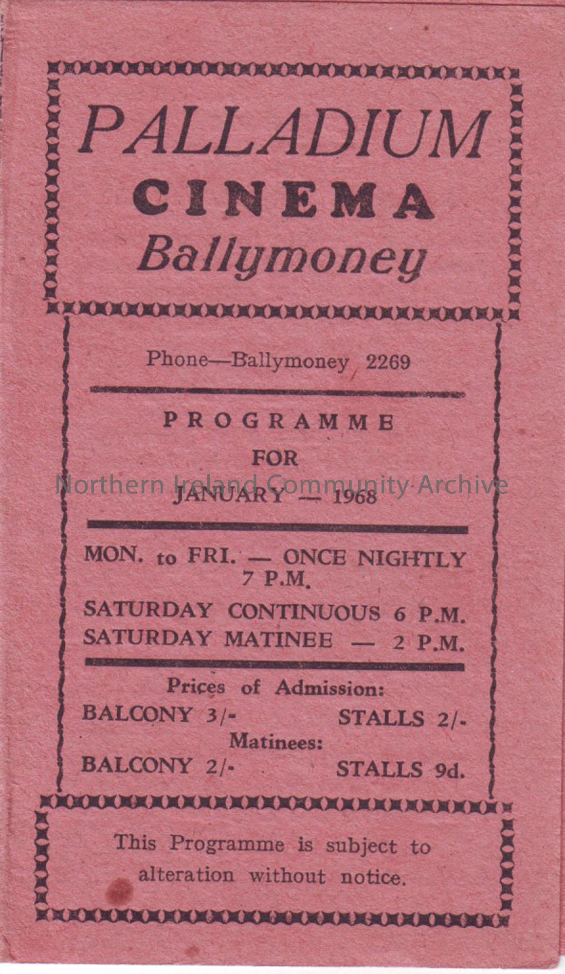 pink monthly programme for Ballymoney Palladium cinema- January 1968