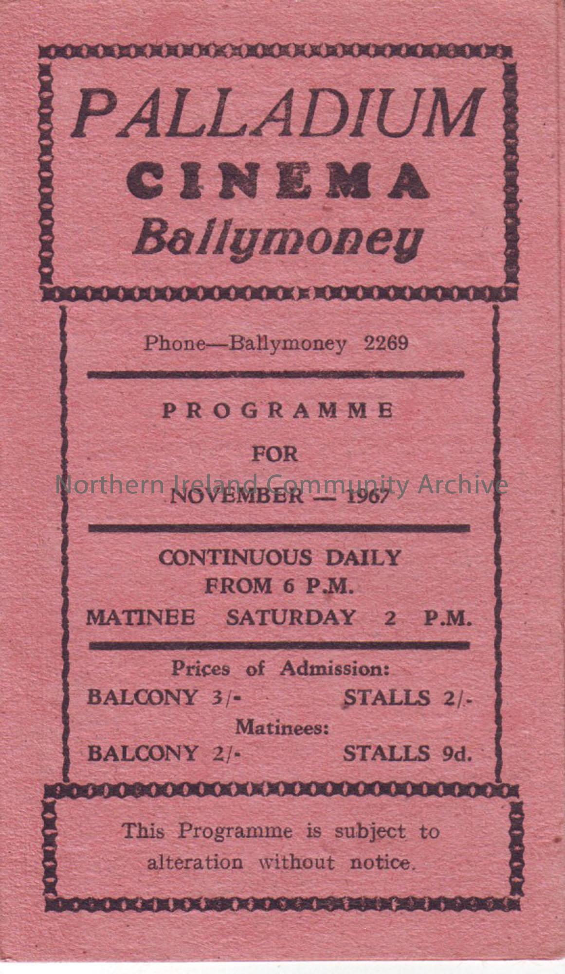 pink monthly programme for Ballymoney Palladium cinema- November 1967