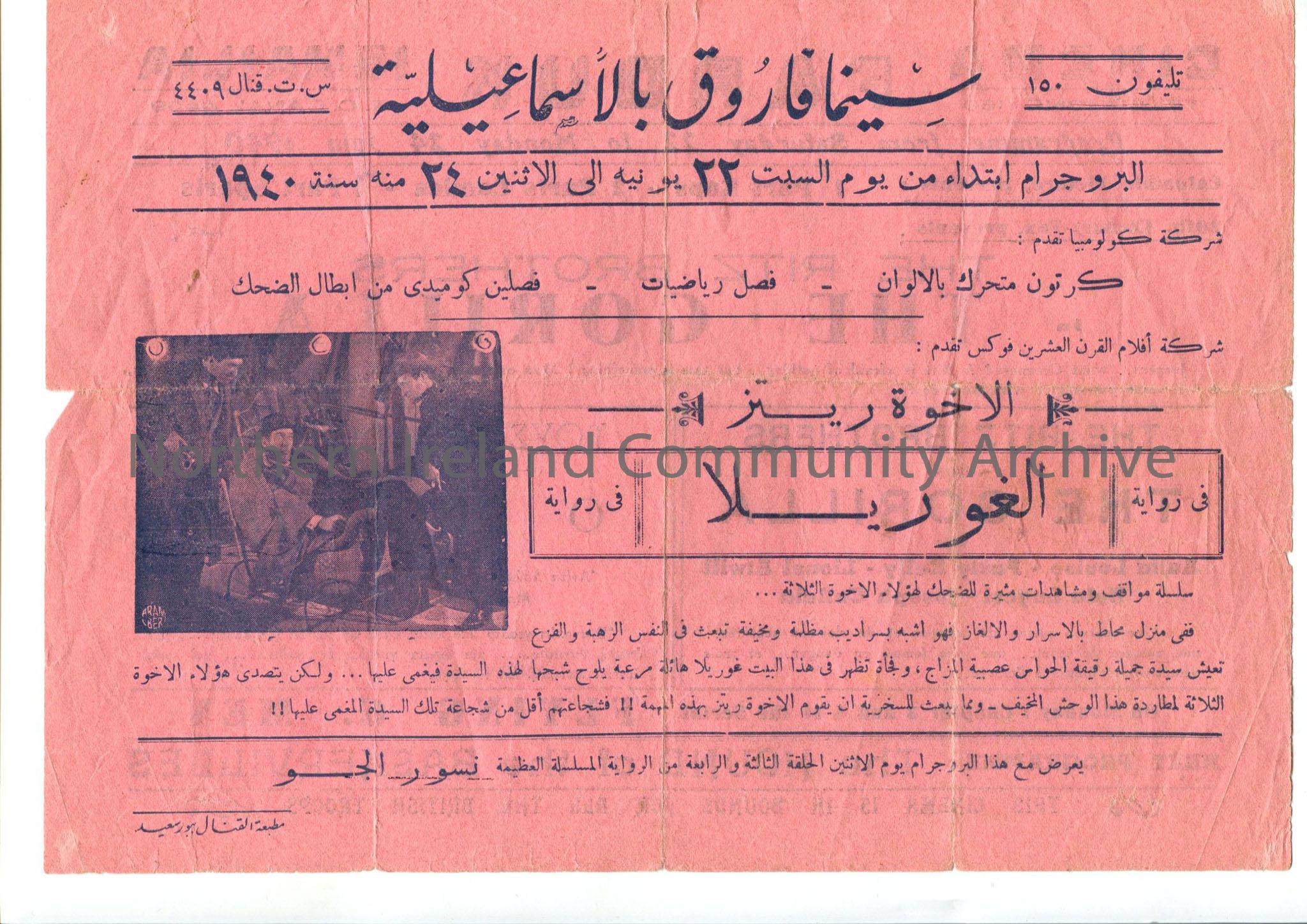 Pink poster showing programme of shows at the Cinema Farouk Ismailia 22nd to 24th June 1940. On reverse is writing in Arabic and a photograph of three men, one in a pram.