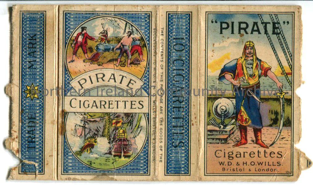 “Pirate” Cigarettes box flattened out. Picture of a pirate wearing a yellow headdress and blue trousers with a curved sword on one side and two images…