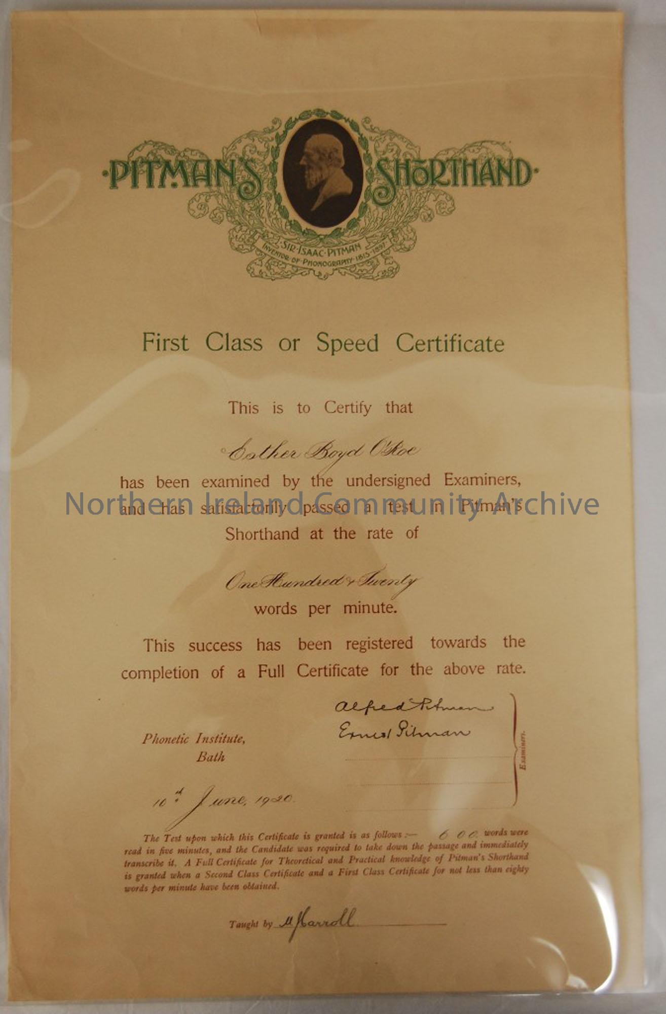 Pitman Shorthand, First Class, Esther Boyd O’Roe, 120 w.p.m. 10 June 1920