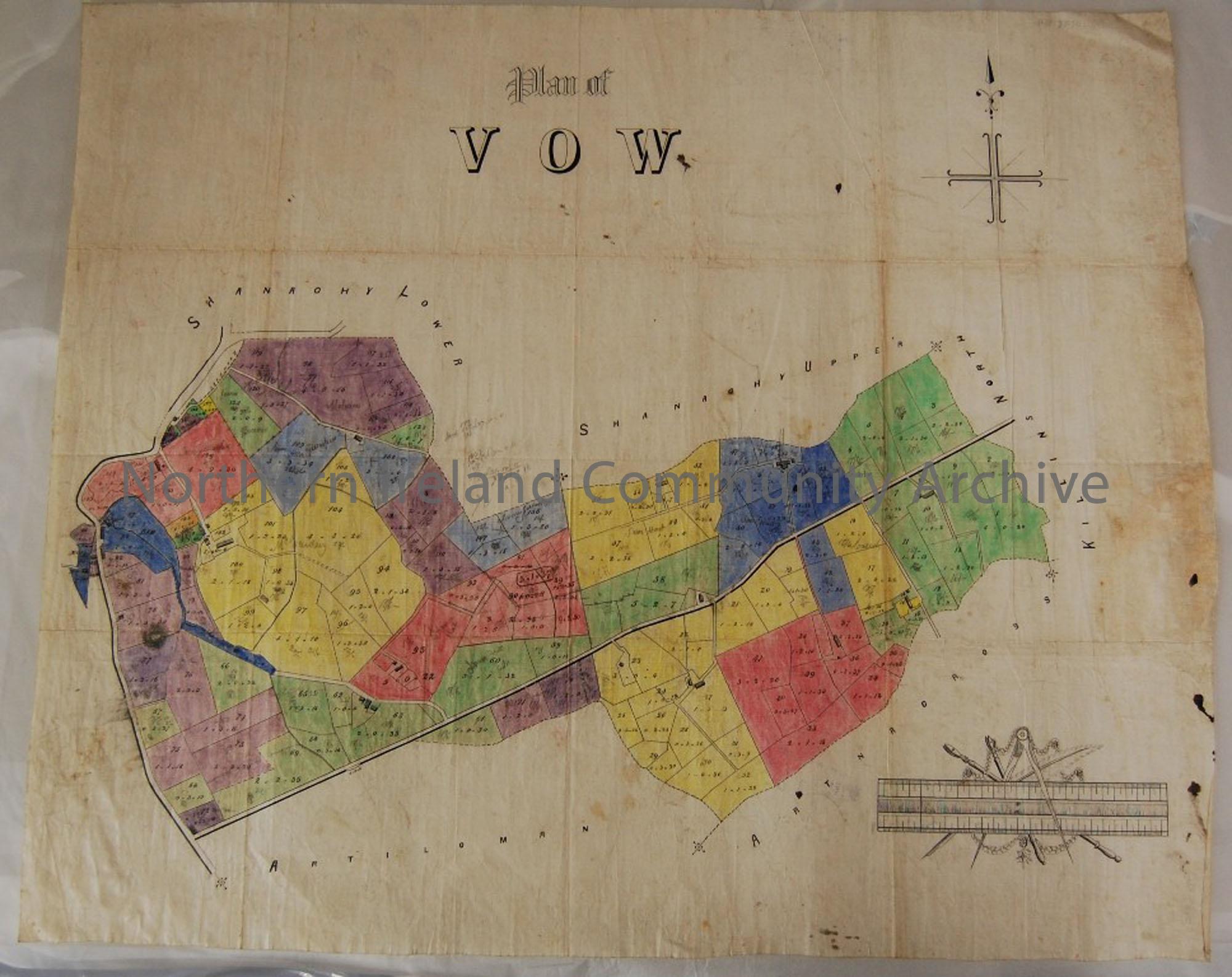 Plan of Vow. Map showing areas for tenancy numbered and coloured; date unknown.